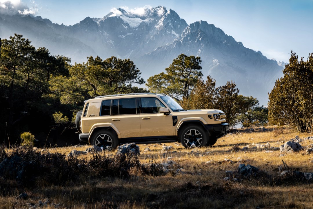 新车采用“未来经典”设计理念,融合经典越野姿态与精致科技元素,不含备胎的车身尺寸为4909/1976/1855mm,含备胎为5055/1976/1894mm,轴距达2910mm,搭配近1:1的宽高比、直立A柱与超低窗线,营造出挺拔硬朗的姿态与通透视野。