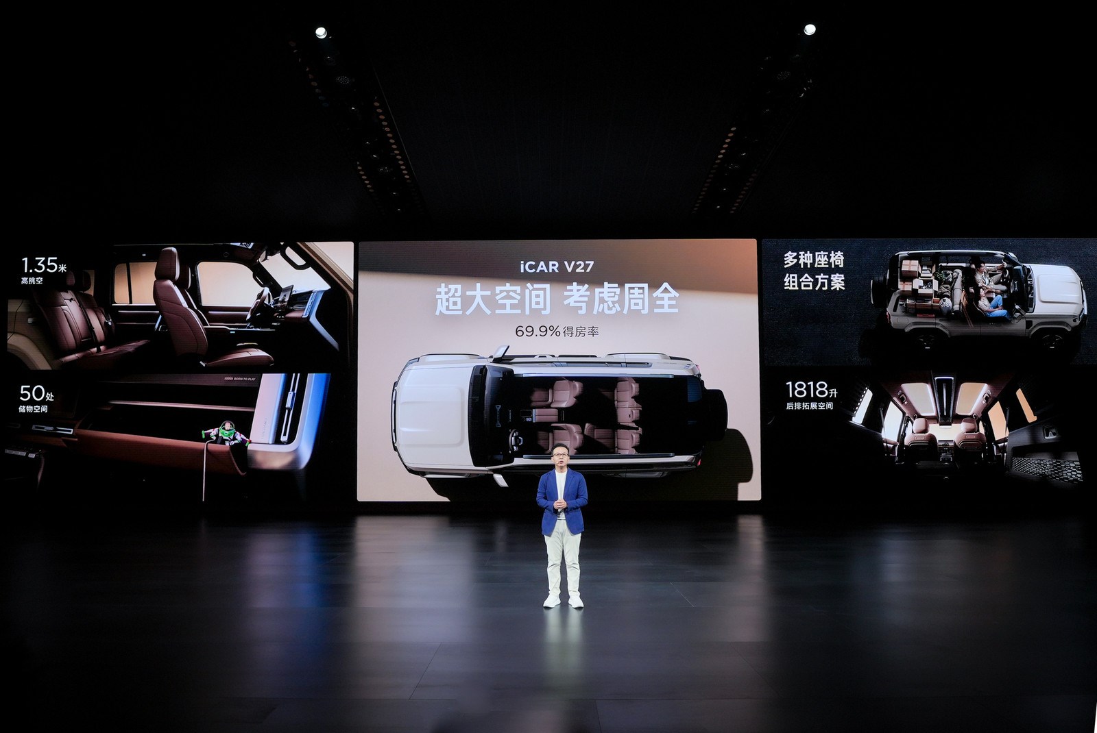 针对家庭出行需求,V27打造了极致通透大空间,车内挑空高度达1350mm。后排座椅放倒后可形成1818L方正储物空间,搭配定制床垫可秒变2150×1050mm舒适大床。全车多达50处储物空间,可妥帖安放每位家庭成员的小物件。