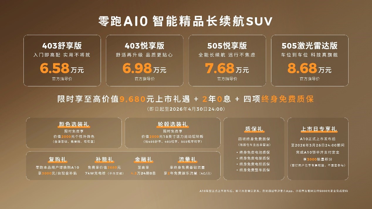 3月26日,零跑汽车在金华举办以“一路都很灵”为主题的全球发布会,正式推出全新A平台首款全球化车型零跑A10。新车提供403km与505km两种续航版本,共4款配置车型,上市指导价为6.58万-8.68万元。零跑汽车方面表示,作为零跑面向全球主流市场的全新A系列首款车型,A10从研发之初即按照全球标准打造,未来将进入近40个国家和地区销售。