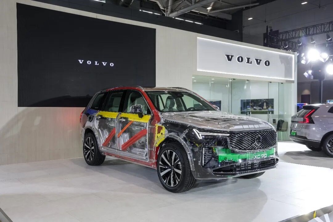在展会上,沃尔沃展出了一台XC90透明版安全展示车,通过分色涂装的白车身,将内部的安全结构和用料“透明化”地呈现给观众。车身以不同颜色标示材料:绿色部分为铝合金,暖色系为高强度钢,其中红色的硼钢强度高达1500兆帕,并通过“6横6纵”笼式车身结构保障乘员生存空间。该车在车头、车尾及B柱下端等关键位置设有溃缩吸能区,用以吸收和缓解碰撞冲击。制造工艺上,全车约6000个焊点全部经过100%检测,且沃尔沃每6周会抽取一台白车身进行“撕毁”检测,从源头确保焊点质量与车身结构的绝对稳固。