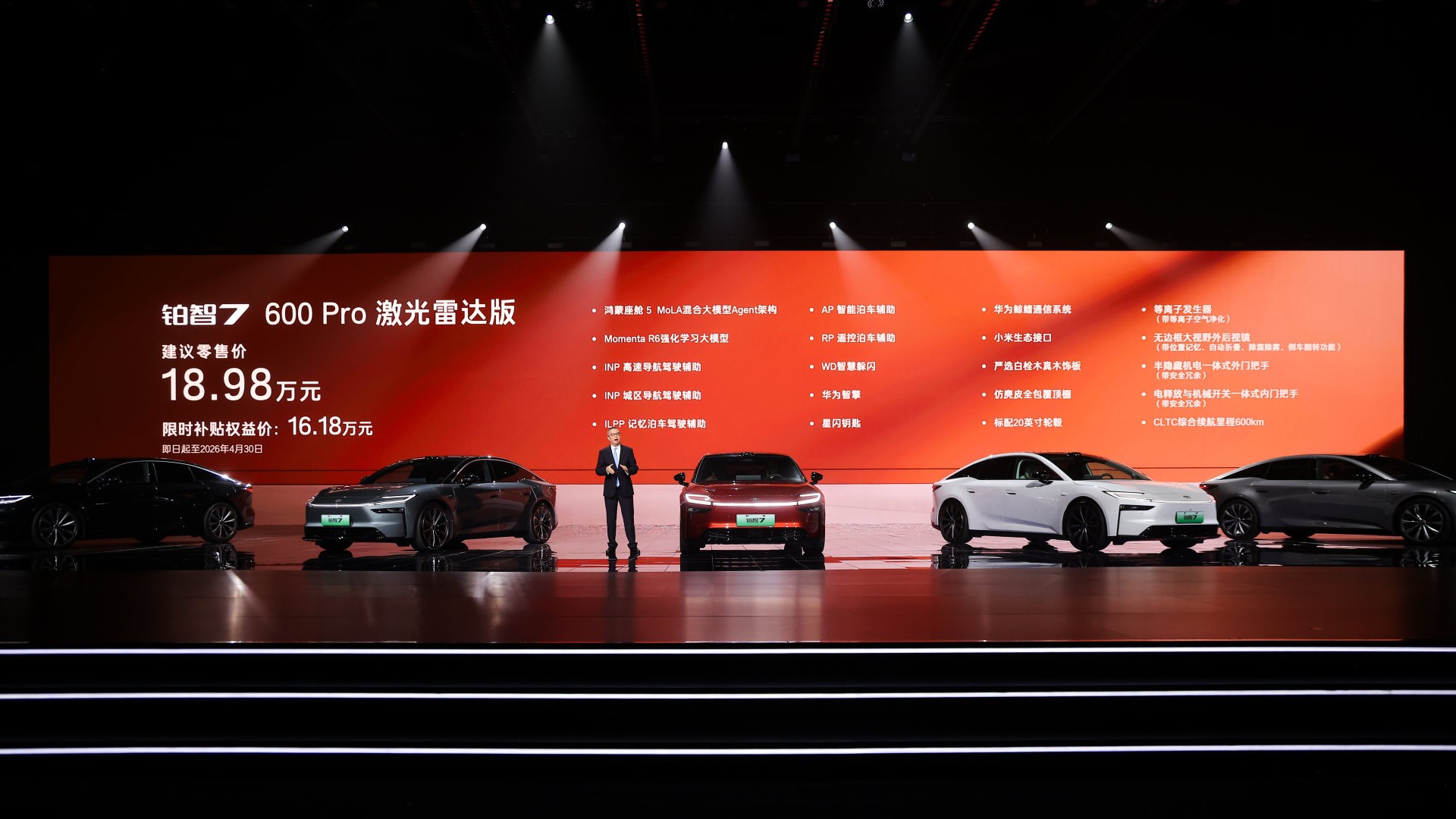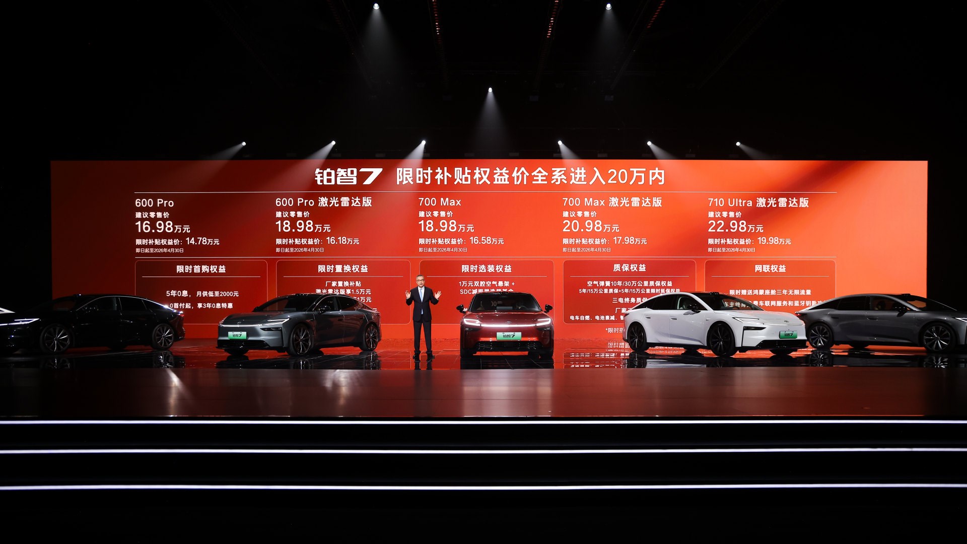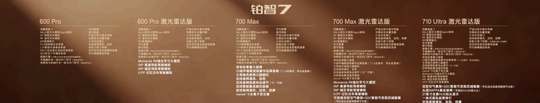 700km续航提供三个版本,全部标配双电机零重力座椅、主驾大腿托、后排智能触控面板和23扬声器等超11项配置,过往30万以上车型的豪华舒适配置,全部下放到20万以下。700Max版聚焦长续航与高阶舒适,限时补贴权益价16.58万,加5000元即可选装行业最低价的双腔空悬,拥有17万级双腔空悬纯电家轿第一车。700Max激光雷达版限时补贴权益价17.48万,增加Momenta R6大模型高阶智驾辅助。再加5000元选装基金即可升级至700Max激光雷达双腔空悬版,一次性配齐华为鸿蒙座舱5、Momenta R6大模型激光雷达智驾、双腔空悬等超豪华三件套,20万内唯一。