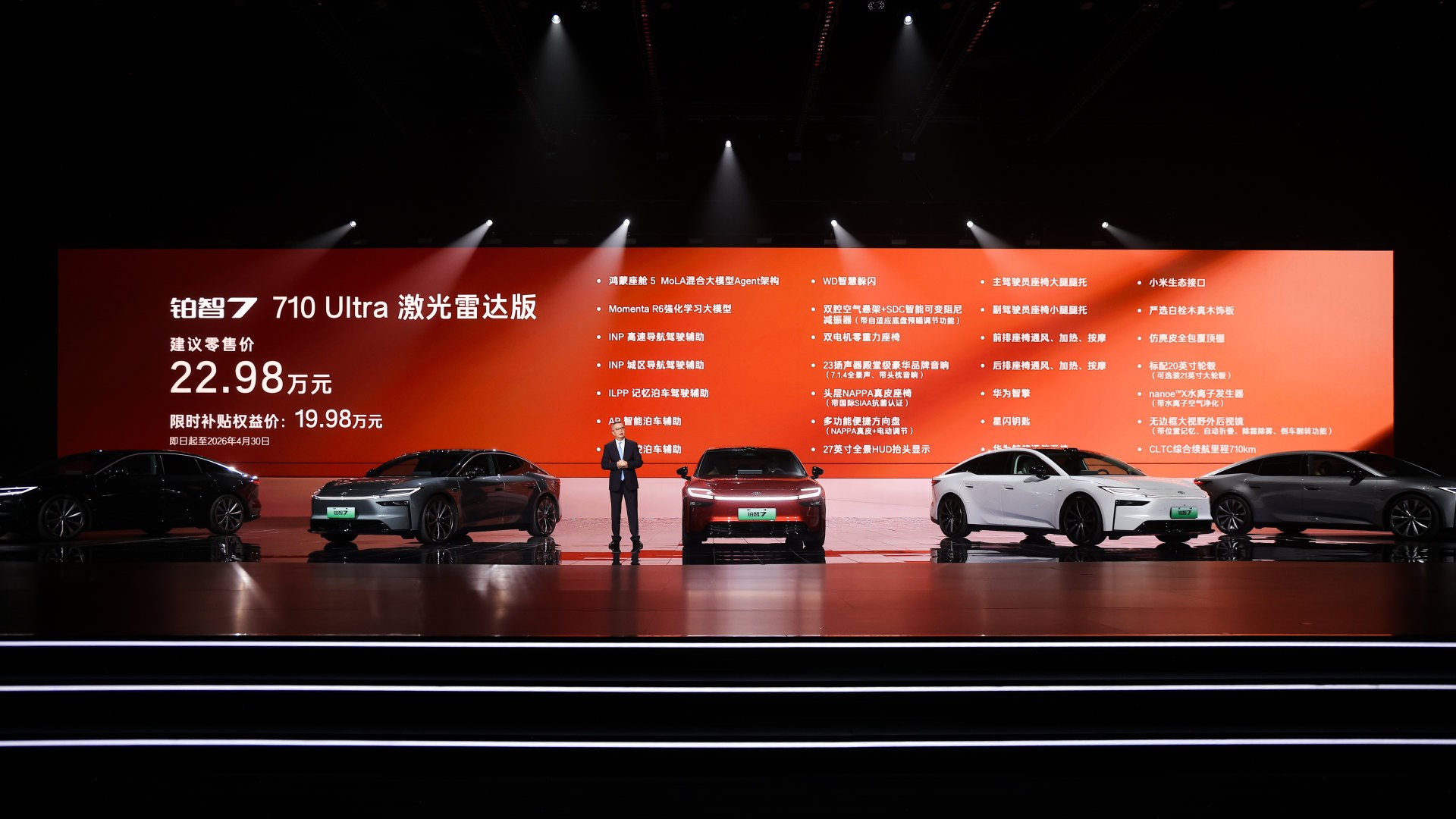 顶配710 Ultra激光雷达版限时补贴权益价19.98万,不仅集齐鸿蒙座舱和激光雷达智驾、双腔空悬、零重力座椅、23扬声器等全豪华配置,实现豪华“一步到位”,还把给足情绪价值的27英寸全景HUD抬头显示、NAPPA真皮方向盘和座椅、智能香氛系统等统统安排,是同价位最超值的选择。