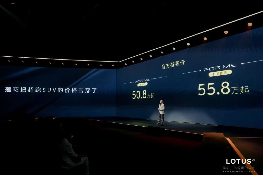 3月29日,莲花For Me正式上市,并于次日开启首批车辆全国交付。标准版50.8万元、SE特别版55.8万元的定价,将拥有纯正超跑基因的混动SUV拉入50万级主流高端市场。这一数字相比预售价分别下调2万和3万元,以“击穿超跑SUV价格”的姿态向市场发起冲击。