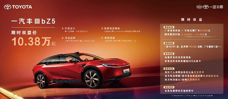 纯电车型bZ5在4月推出限时权益加码,置换权益升级为不限品牌厂补8000元,更可叠加9000-14600元的国家置换补贴,550JOY车型叠加厂补及国补后,限时权益价低至10.38万元。金融权益也是诚意满满,0首付3年0息,低月供5年0息,降低购车门槛(置换、金融二选一)。同时匹配免费充电桩、500元电卡、非营运车主三电终身质保及电池三兜底保障政策,为后续用车提供安心保障。4月购车用户还可免费获赠天窗遮阳帘。
