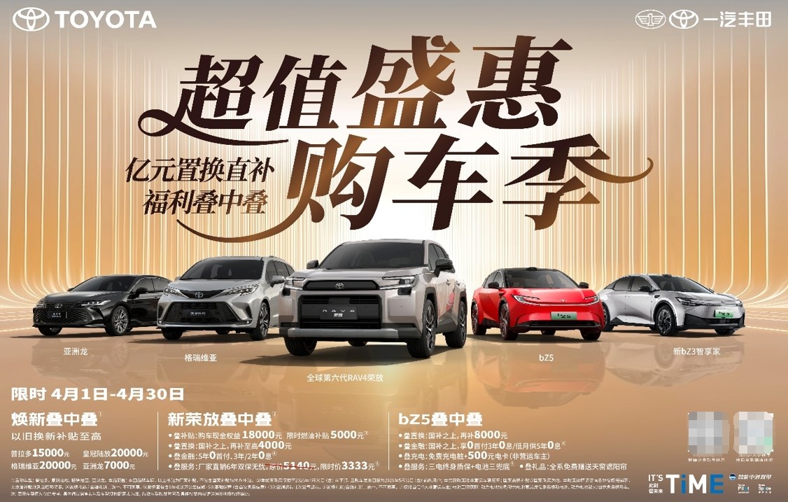 不负春日好时光,一汽丰田超值盛惠购车季同步开启,亿元置换直补福利叠加,诚意满满敬献广大用户。41日至430日,普拉多、皇冠陆放、格瑞维亚、亚洲龙车型,本品牌以旧换新可享至高20000元补贴;430日(含)前下订新荣放,且在2026531日(含)前完成购车开票的用户,可享18000元现金权益+5000元限时燃油补贴,国补之上再叠加至高4000元置换补贴;也可选择50首付、前2/30息的金融补贴(置换、金融二选一);同时还能享受厂家直销6年双保无忧服务补贴(原价5140元,限时价3333元)。