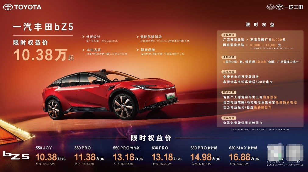 纯电车型bZ54月推出限时权益加码,置换权益升级为不限品牌厂补8000元,更可叠加9000-14600元的国家置换补贴,550JOY车型叠加厂补及国补后,限时权益价低至10.38万元。金融权益也是诚意满满,0首付30息,低月供50息,降低购车门槛(置换、金融二选一)。同时匹配免费充电桩、500元电卡、非营运车主三电终身质保及电池三兜底保障政策,为后续用车提供安心保障。4月购车用户还可免费获赠天窗遮阳帘,舒适加倍。