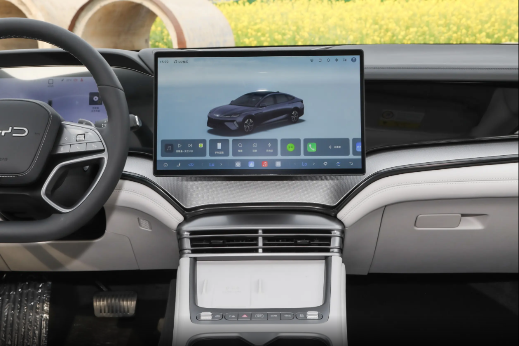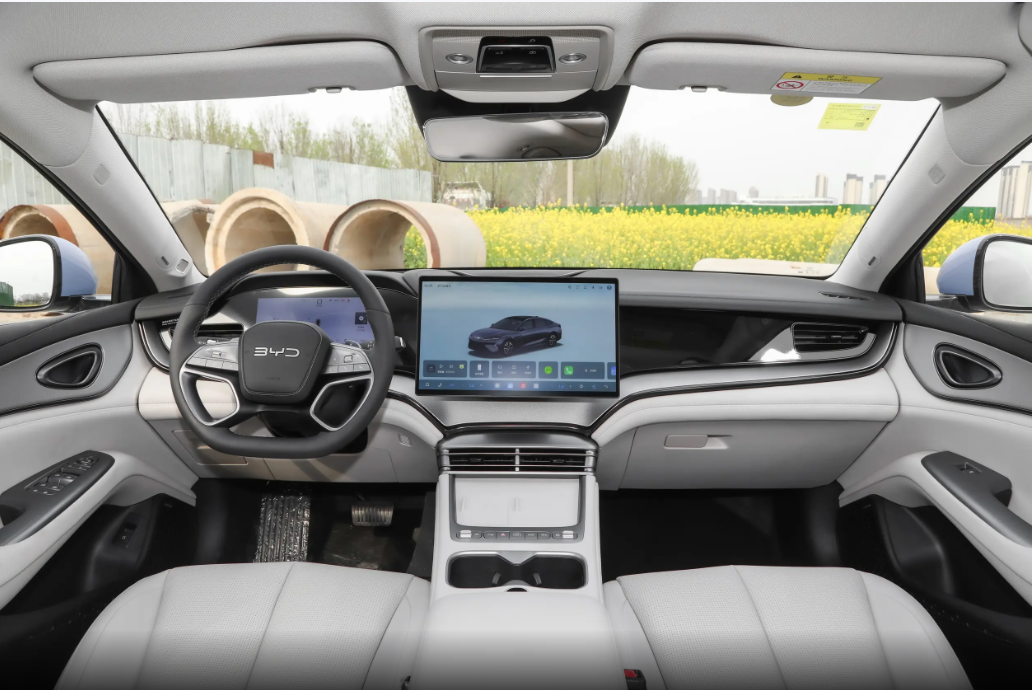 拉开车门坐进来,第一感觉就是清爽舒服。海豹07EV内饰是简约风,浅色调为主,搭配深色饰板和金属条点缀,既开阔不压抑,又有质感,很符合海洋网家族调性,特别适合家用。前排中控台是分层设计,很规整。10.25英寸全液晶仪表看信息清晰直观,15.6英寸悬浮中控屏可自适应旋转,实用又有科技感。屏幕下方留了常用物理按键和开放式储物区,放手机、钥匙很方便,兼顾了实用性。