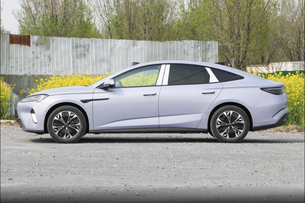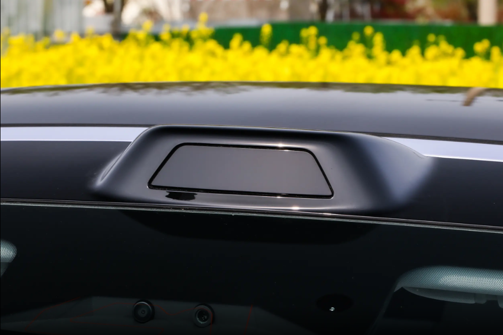 侧面轴距长、前悬短,姿态又低又修长。大溜背造型好看,后排头部空间也够用。隐藏式门把手和车身齐平,风阻更小,线条也更干净。上下两条腰线让车身显得修长,还有肌肉感,轮毂是低风阻样式,运动感更强。除此之外,车尾同样简洁,贯穿式尾灯是亮点,点亮后辨识度很高,后包围的导流口和前面呼应,整体空气动力学设计做得很到位。