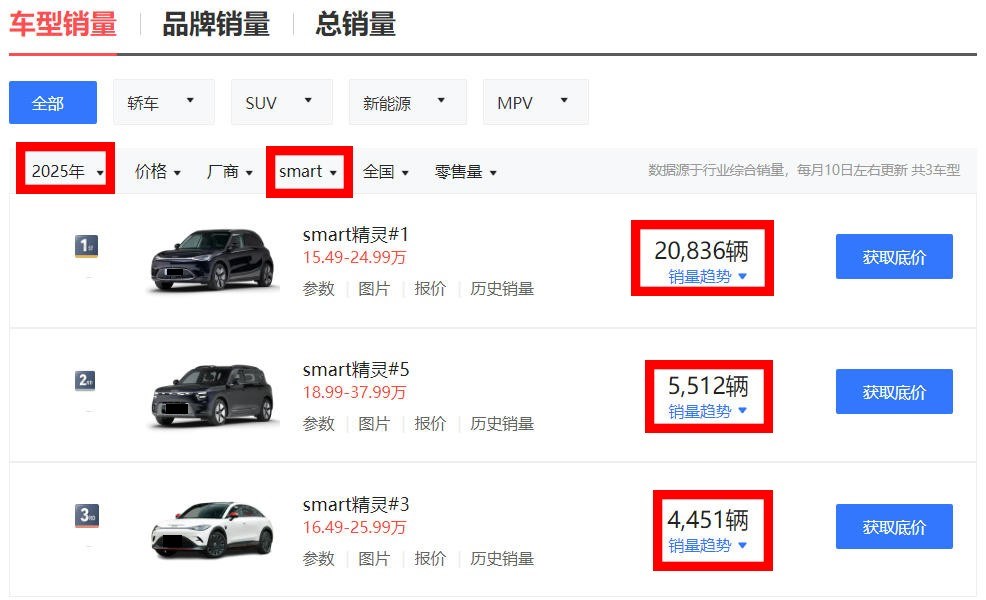 更扎心的是内部的销量结构。撑起这个品牌销量大梁的,还是那个保持了两座小车传统、售价最低的smart精灵#1,它在2025年贡献了20836辆的零售销量。而作为“大车化”战略代表的精灵#3和精灵#5,同期的零售销量分别仅为4451辆和5512辆,两款大车加起来,还不到入门小车销量的一半。