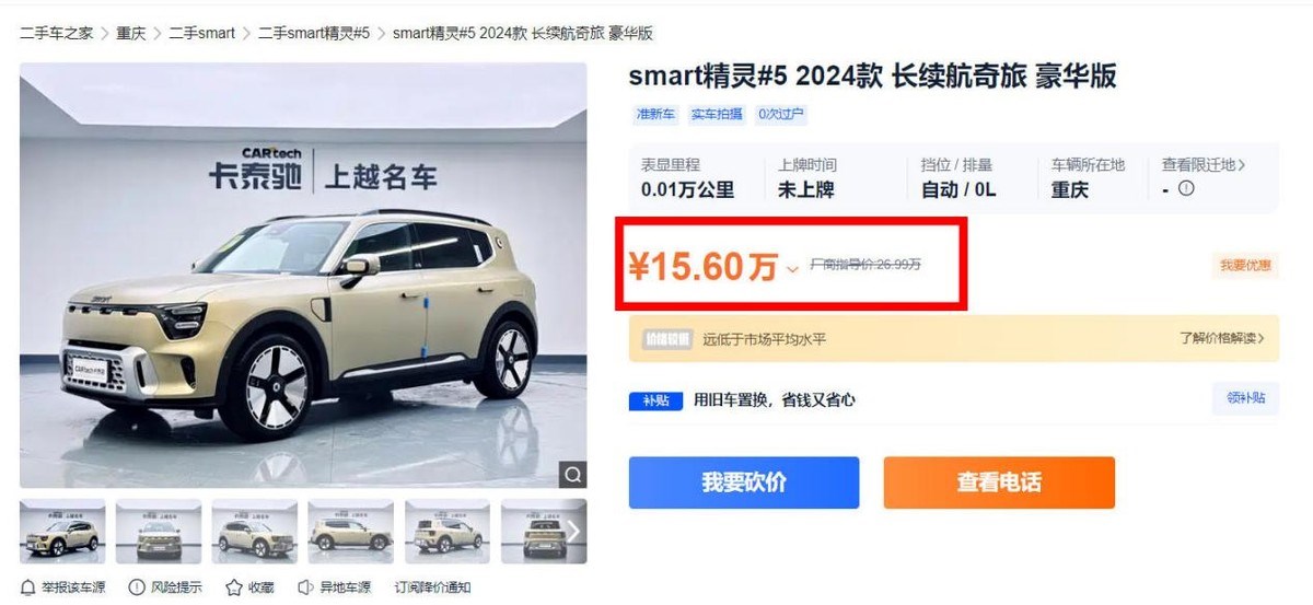 其次,价格策略已经失效。 参考精灵#5的定价区间,预计精灵#6 EHD的起售价可能在19万元左右。而在这个价位,消费者能买到的是技术更领先、配置更丰富的国产新能源车型。更致命的是,Smart的品牌溢价能力正在快速缩水。当大量零公里精灵#5以5.3折的价格在二手车平台甩卖时,消费者对Smart的价格体系已经产生了根本性的不信任。谁会愿意花20多万买一台新车,转头就贬值10万?