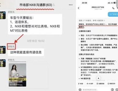还有一张网络聊天图片显示,群名为“市场部NX8沟通群”,群内“舒胜先”发文称,车型今天要输出:1、话语体系,2、NX8和理想i6对比表格,NX8和M7对比表格。