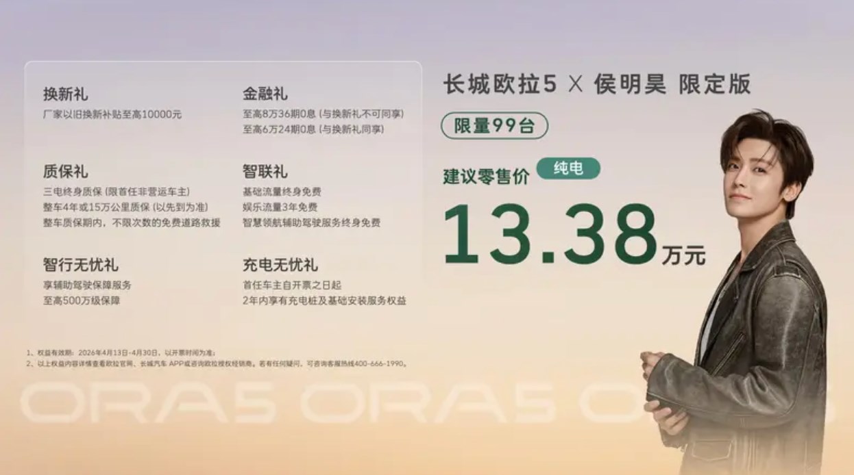 4月13日,买车网Buycar获悉,长城欧拉5限定版纯电版正式上市,建议零售价13.38万元,欧拉5限定版售价与长城欧拉5 580km激光雷达版一致,新增敦煌绿车漆、专属尾标、中央扶手箱刺绣等多项专属配置,并可享“换新礼”、“金融礼”等多重限时好礼。