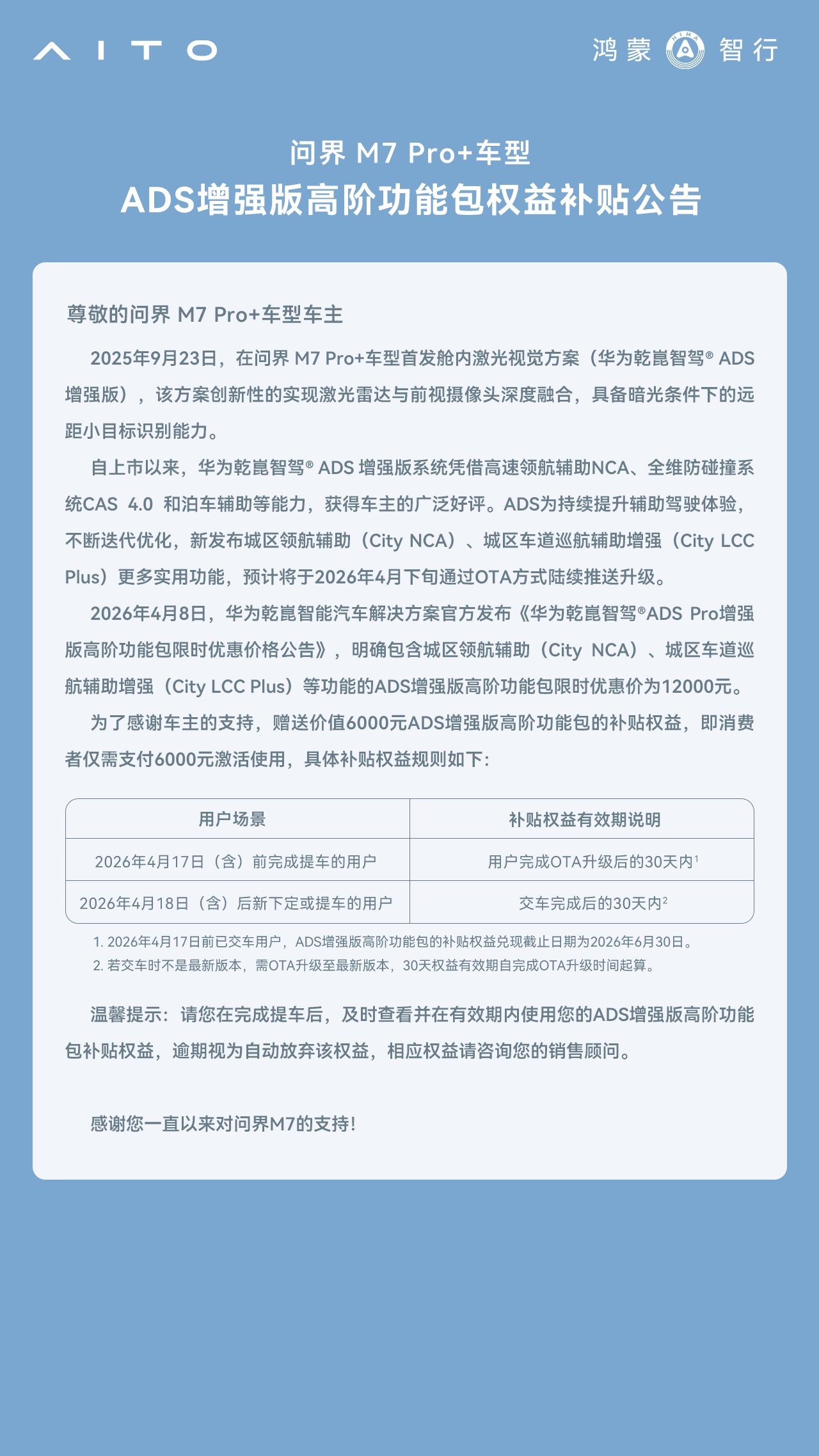 根据当前销售政策,问界M7 Pro+车型的ADS增强版高阶功能包限时优惠价为12000元,问界限时提供价值6000元的ADS增强版高阶功能包权益补贴,即消费者仅需支付6000元即可激活使用该功能。