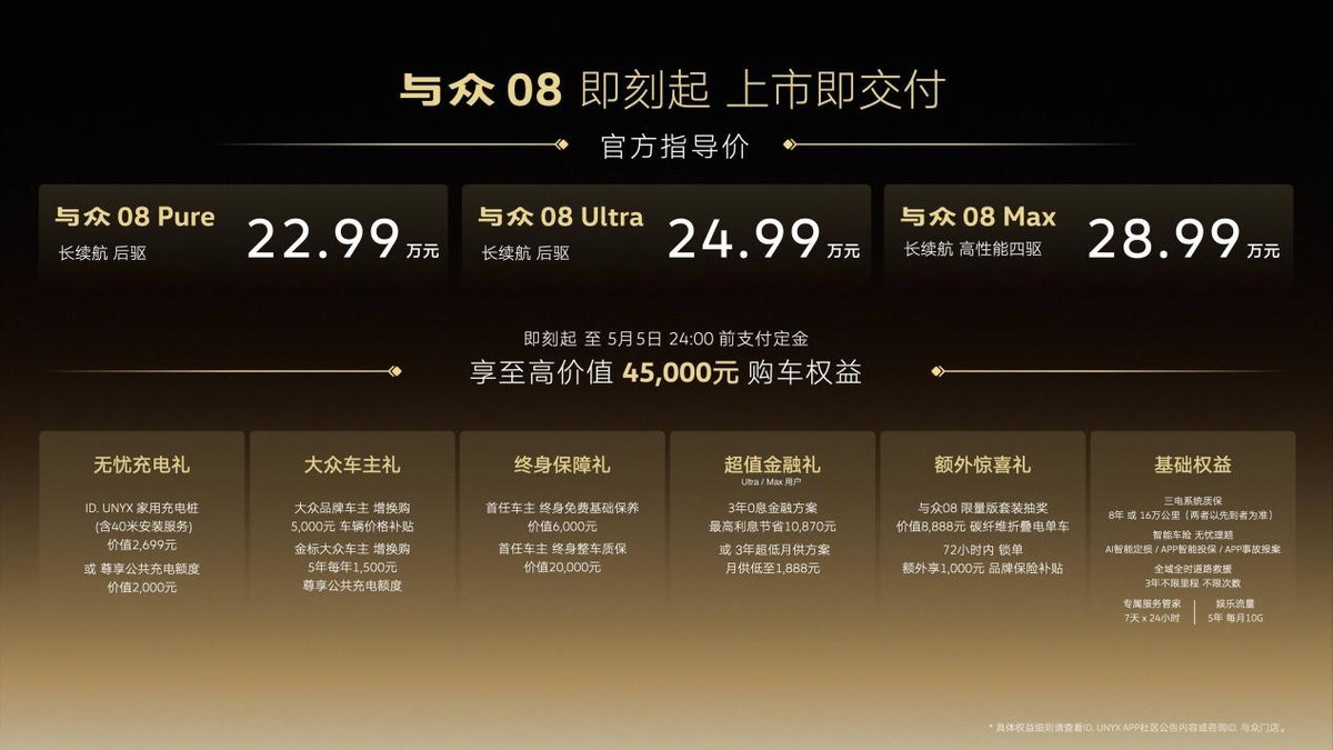 2026年4月16日,金标大众全新旗舰纯电SUV——与众08在深圳正式上市,新车推出Pure、Ultra、Max三款车型,官方指导价22.99万元-28.99万元,同步推出至高4.5万元限时购车权益。作为大众汽车(安徽)数字化销售服务有限公司主导、小鹏汽车深度技术赋能的旗舰产品,与众08以24个月开发周期落地,不仅是大众“在中国,为中国”战略的关键落地,更标志着传统合资品牌正式以“全栈智能+德系标准”切入中高端纯电核心市场。