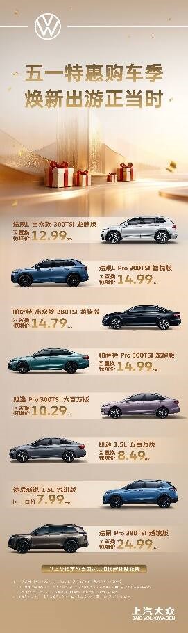 置换焕新,惠享五一!趁着假期,不妨前往上汽大众授权经销商,解锁专属置换福利,带着家人与热爱,奔赴一场说走就走的旅行,让德系品质陪伴每一段美好旅程!