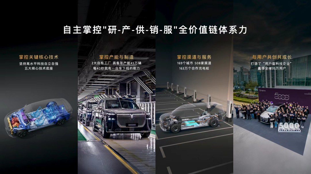 岚图坚持核心技术自主研发,构筑五大坚实技术底座,累计拥有6102件专利;同时,岚图自有两座国家级示范工厂,具备年产能45万辆、每40秒就有一台车下线的能力;渠道与服务已覆盖169个城市,508家渠道,163万个合作充电桩,拥有触达用户最后一公里的能力,并建起了跟用户共创共成长的体系,获得了超过35万名用户真诚的喜爱和支持,实现了对“研—产—供—销—服”全价值链的自主掌控。
