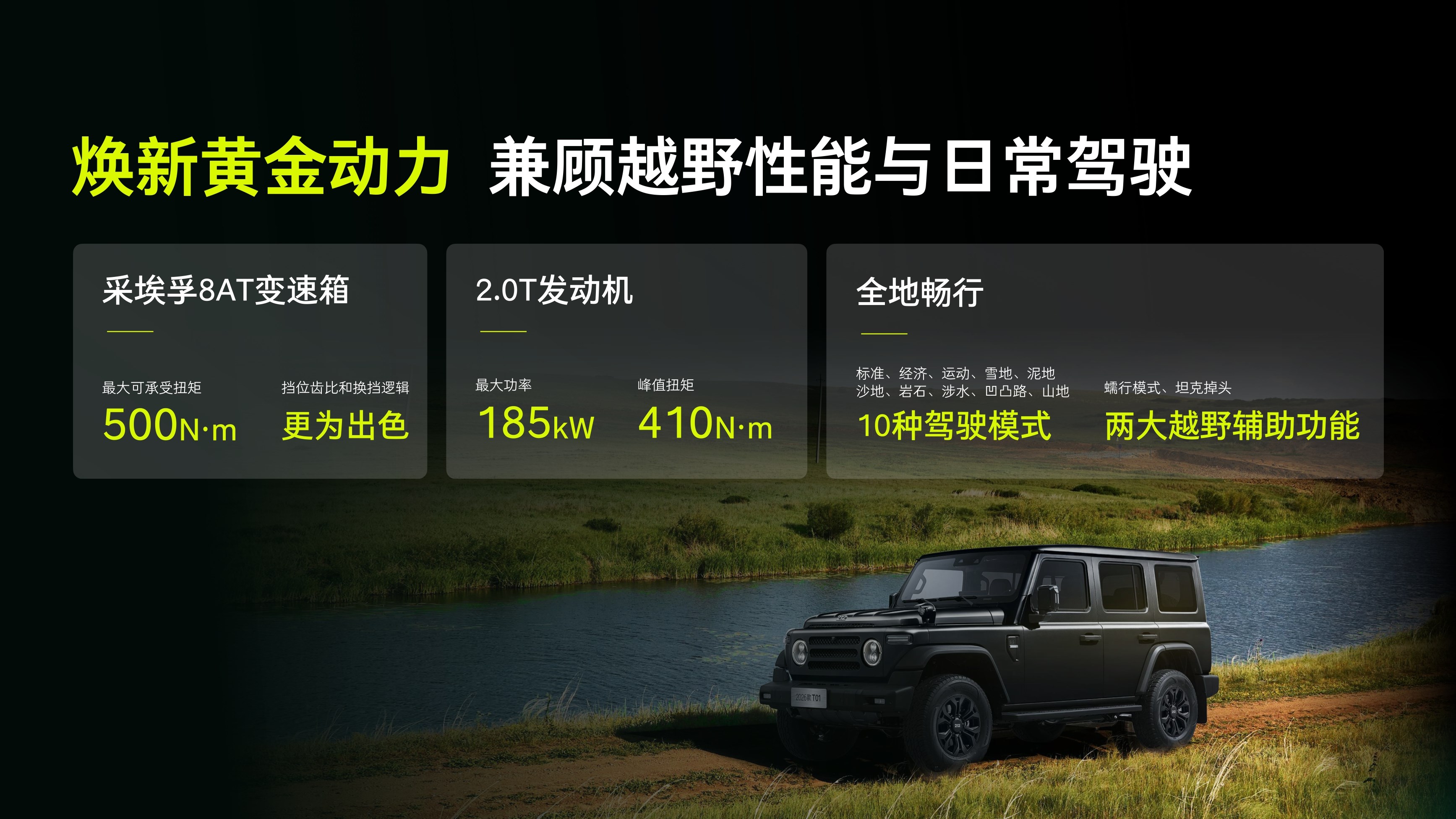 同时,2026款T01 的升级,也不只是一次常规的年度升级,而是一场围绕“更强性能与更高舒适”的全面进化——我们把越野的硬实力,和日常的从容感,同时推向了一个新的高度。首先,是动力传动系统的跃升,全系标配采埃孚8AT变速箱,配合全新调校的2.0T发动机,在任何复杂路况下,都能持续输出更充沛、更稳定的动力;其次,在极限条件下更强,T01全系标配博格华纳大分动器,低速四驱模式下,扭矩放大至2.64倍,极限能力再提升12%,更坚固的结构,配合智能扭矩分配系统,与ABS、ESP协同工作,让强大动力既能爆发,也能被精准掌控;第三,多项舒适性配置升级,对整车NVH进行系统优化,加之高阻尼衬套与强化隔音材料,提升整车的静谧性与驾乘质感;为了满足极致玩家,2026款T01长风还新增了高强度前方管桥,越野性能独一无二。